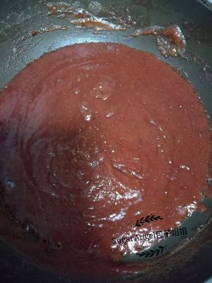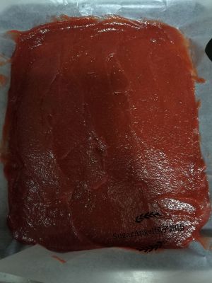 我用的烤箱盘,盘中铺上油纸,把熬好的山楂酱放入盘中,5毫米厚度。用刮子或者勺子,把酱刮平。