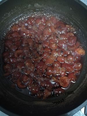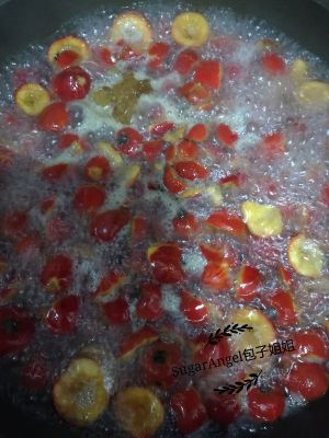 盐水浸泡好后,把山楂、水、黄冰糖(蔗糖)放入锅中熬煮,锅里有一些沫子,记得用勺子撇去。
