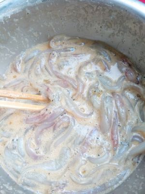 将鸡蛋、玉米淀粉、盐、生抽、黑胡椒粉调成糊状,倒入与银鱼搅拌混合均匀