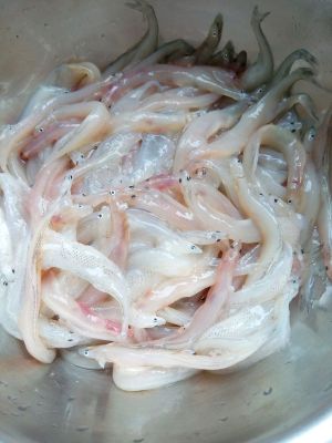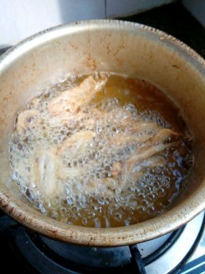 油锅70度下小鱼,因为调糊了,所以会连在一起不松散,炸至金黄捞出