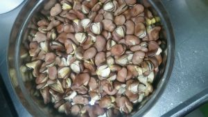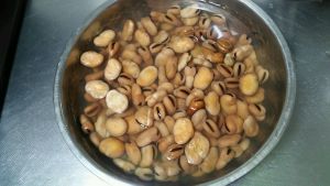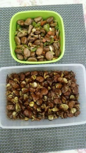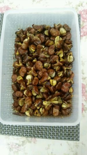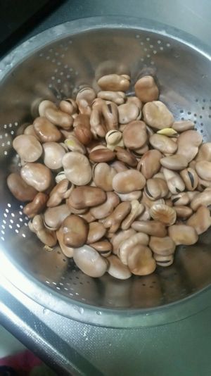 煮过的蚕豆在头部用小刀划一下(不要太深),然后有阳光的话就晒干,我这一直下雨我就用烤箱烤了30分钟左右,自己看时间,烤干点好