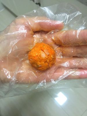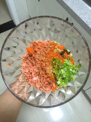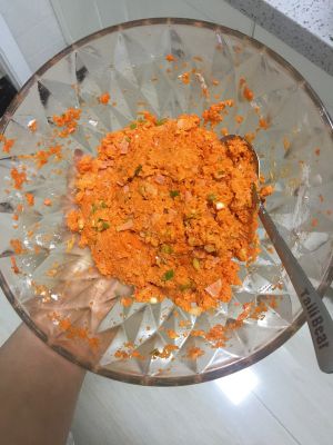 胡萝卜用料理机打碎,小葱和香肠切丁! 把所需的材料全部混合在一起!