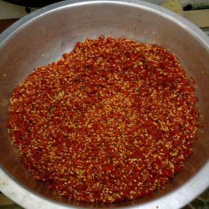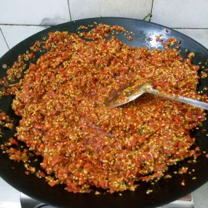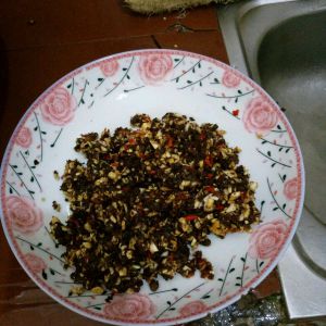 把辣酱倒进去,边搅拌。怕会粘锅。大概五分钟左右应该都可以了。