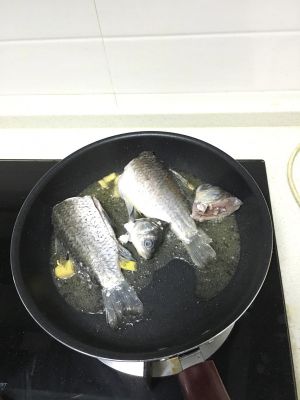 油在锅里热好放入姜,烧一会以后把鱼放入锅里