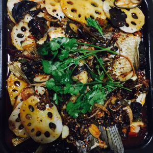 开始炒料底,料底根据个人口味添加咸淡辣椒!入油,偏多,加入葱姜蒜,干辣角,加入豆瓣酱,辣椒面,火锅底料适量,洋葱,翻炒,然后加入半碗水,水量鱼烤盘深浅匹配,保证底料倒入盘后不溢出能基本没过菜。底料水开后,调入花椒粉,鸡精等调料。然后淋在鱼上。将烤盘送入烤箱,200度,10分钟,烤盘内沸腾即可!