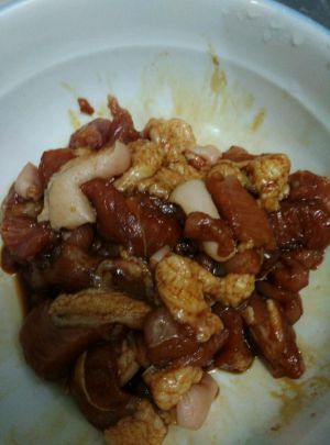五花肉切小块,加入料酒和酱油腌制10分钟