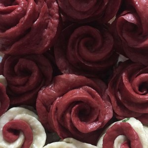 和面,把红曲粉,玫瑰酱,面粉,水,酵母一起揉成团,面光,手光,盆光哦,然后盖上保鲜膜,静待发到两倍大
