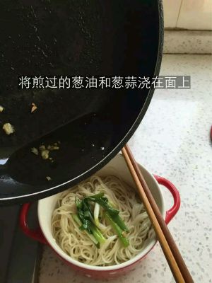 将煎过的葱油和葱蒜浇在面上
