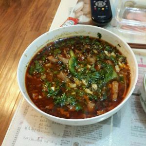在肉片上放适量的花椒和香菜末,蒜末。锅里热油,冒烟后浇淋在花椒上!搞定