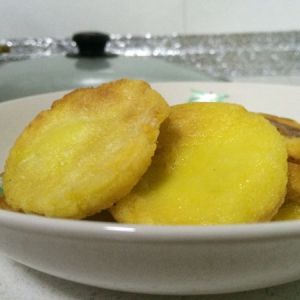 锅中倒入油,油热后,关小火,把饼子放入锅中。不要急着翻面,油尽量多些,不容易焦。等一面黄后,翻面继续煎。