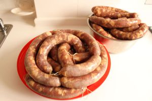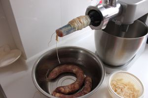 肠衣装到灌肠嘴上,用棉线把口系上就可以开始灌制了
