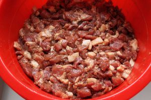 调料全部拌匀后,和切好的肉拌到一起,放置四小时以上,隔夜更好