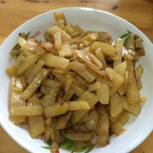 热锅,锅内放油(油需要多一点,不然土豆炒不熟,还容易粘锅),油热后下土豆,翻炒。不停地翻炒,土豆变至金黄色后放入一勺盐,三勺生抽,继续翻炒。