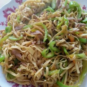 下干豆付丝,青椒丝翻炒,加入盐,味素,酱油调味。