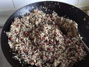 倒入芝麻和花生翻炒到有细小的拉丝后关火。