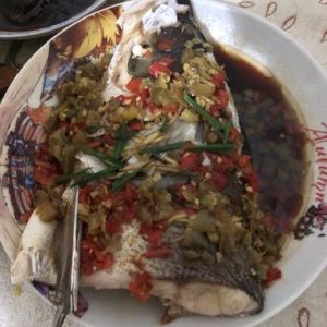 在炒锅中放一勺油加热的同时,在蒸熟的鱼上放入红、黄剁椒各一勺,并放上姜丝和葱丝,倒上适量的蒸鱼豉油,然后将烧烫的油浇在鱼头上,剁椒鱼头就算大功告成了,开吃!