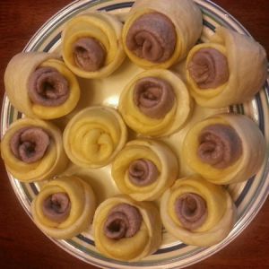 卷好的面皮,用刀在筷子压出的中线上切开,调整底部,就成了两朵美美的玫瑰了。如果想要盛开般的花型,就反方向卷。