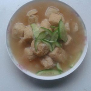 小火慢炖,汤中加少许盐,5、6分钟后,加一点味精,加切好的黄瓜片,出锅。