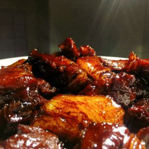 这时候肉基本已经吸收了味道,加冰糖和蚝油翻炒一下,继续焖五分钟,看下汤吸收了就可以出锅。如果汤汁比较多,可以开盖大火收汁,收汁时不停翻炒,因为放了冰糖容易粘锅。中间肉是否烂了可以用筷子戳一下,黑猪肉比较容易烂,其他的时间略长些