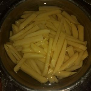 5. 锅中倒油,开火,拿根筷子放入锅中起小泡就可以放土豆炸了,小火炸至金黄捞出控油,重新开火油到七八成热时,放入土豆条复炸两分钟捞出即可