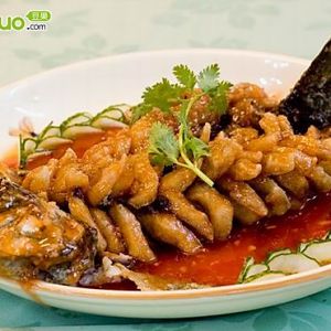 热油锅,把鱼肉用干淀粉滚匀,使其表面表穗刀口分开,倒提鱼尾放入油中炸熟,待呈金黄色酥透后捞出摆入盘内。