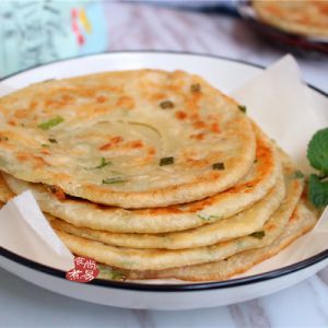 烙至葱油饼两面焦黄色,香味四溢时,即可取出食用。