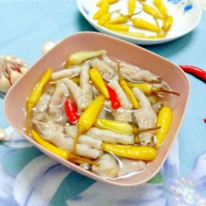 泡椒、姜片、大蒜、小米椒、倒入容器(喜欢吃辣可以把小米椒切碎)