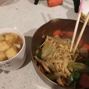 先将肉爆炒再加青椒和胡萝卜,微微炒熟加面条翻炒,加入生菜,继续翻炒,快出锅时加入酱油以及盐,最后开至小火加入花生酱一勺翻炒均匀即可。