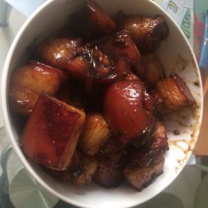 下锅炒糖色,下五花肉炒至金黄,下葱姜炒出香味,下加饭酒,五香粉,冰糖一块,倒入沙锅炖60分钟。