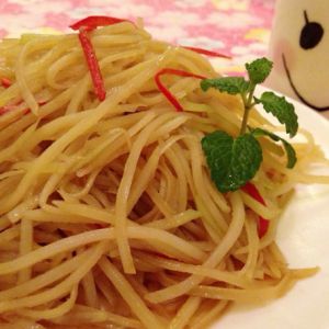 锅内加水烧开,放入土豆丝煮透捞出,过凉开水,沥干水分装盘