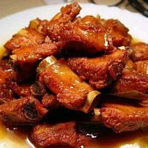 排骨炒至表面微黄,烹入料酒、生抽和老抽,炒匀倒入开水,加白糖和香菇。
