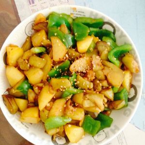 锅里放少点油,爆香葱、姜片。放入炸好的土豆茄子翻炒,放青椒,再翻炒,放盐,滴点酱油,出锅前放蒜沫,翻炒出蒜味!