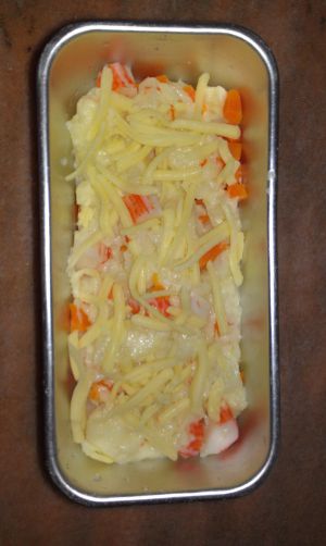 红萝卜和蟹柳氽水,切粒;加入薯泥中搅匀,并铺上芝士;入预热200度烤箱8至10分钟上;