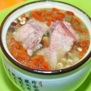 排骨放入汤锅,加水没过排骨, 大火烧开,放姜, 料酒,上盖转小火煮50分钟左右,放入芡实(约1汤碗或抓1把), 淮山(约6片), 小火继续煮40分钟左右, 放入枸杞(冲洗干净),关火后放适量盐即可