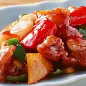 烹调过程:猛火烧锅,放入食用油1000g,加热至160-180摄氏度,放入沾上淀粉的肉料,炸至表面呈金黄色、酥脆捞起,利用锅中余油,放入蒜茸,辣椒片,葱段,加入调好的糖醋汁,再加入湿淀粉调匀勾芡,放入炸好的肉料,再放入包尾油炒匀即可出锅