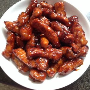 锅让稍微多点油.热至6层热放入里脊炸至微黄(一条条炸哦.不然会结块)然后再2次油炸.炸至金黄捞起去油.锅里放少许油加糖勾芡至粘稠放入里脊上色.快速翻炒.最后放入醋盐味精起锅