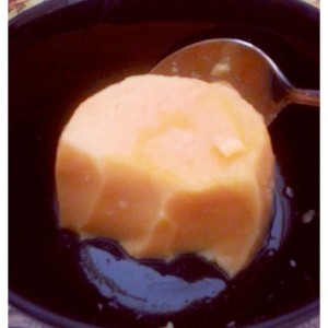 然后将4中的液体倒入3中,放入冰箱。我是周六晚上做的,今天早上拿出来的时候,用小刀沿着杯子的边缘将布丁铲下来,倒扣入碗内。味道好极了!
