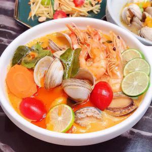 2、2勺虾酱、10毫升鱼露、15毫升香椒油、120毫升椰浆、5毫升柠檬汁,小番茄。
