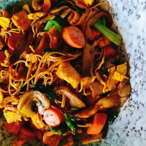 面炒一分钟以后,放青菜,火腿肠,鸡蛋皮,