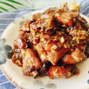 炸好排骨捞出,留底油,下葱姜蒜末炒香,倒入料汁,料汁煮开后加水淀粉勾芡,变浓稠后下入排骨,改小火,翻炒至排骨裹匀料汁即可出锅