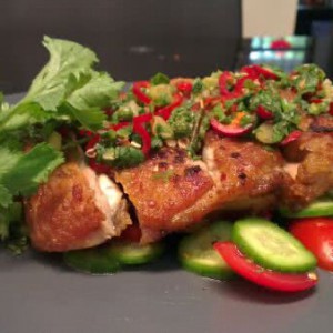 出锅后用厨房纸沥干油分 切块儿 摆盘 淋上先前做的汁儿 或者直接当蘸碟 就这么搞定啦(>_<)酥脆多汁酸辣开胃的泰椒鸡~
