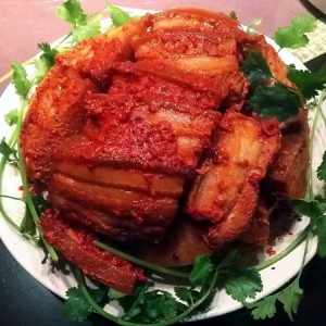 将倒出的蒸汁撇去浮油,如果所剩不多,兑入步骤5蒸肉用的葱姜水,倒入炒锅里烧开放入糖和水淀粉,收汁沟成酱,淋在扣肉上,放上香菜即可。