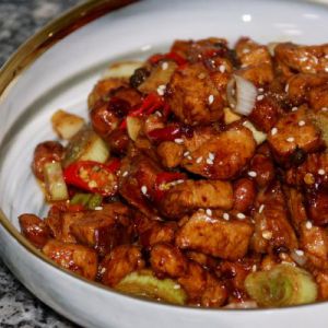 变色后放入酱汁,一点白酒,大火煮汁浓稠即可放葱段,花生米,翻炒几下即可出锅,
