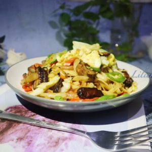 放入面条和鸡蛋,加生抽、白糖、盐、五香粉、香醋炒匀即可。