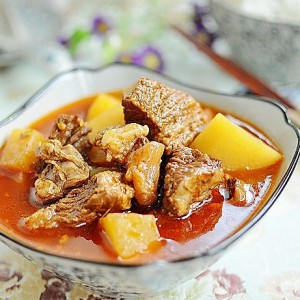 土豆切滚刀块泡在水里。在牛肉炖50分钟后,加入土豆后再炖20分钟