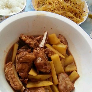 倒油,放入煮好的排骨,翻炒,挂油,倒入调好的小料,放入土豆条,倒入刚刚煮好备用的排骨汤,闷煮