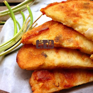 大碗中加入面粉、糯米粉、淀粉(三者比例为3:1:0.5)、鸡蛋、葱花、洋葱、火腿、油、盐、鸡精,并加水搅成面糊