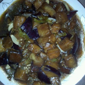 将茄子倒入锅中,个人比较喜欢偏辣口味放入青椒,加入老抽(上色),味达美(提味)不停的翻炒,放适当的盐调小火慢炖,十分钟就差不多了。