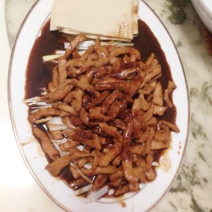 锅里热油倒入里脊肉划炒,炒到变白色盛起备用,锅里留底油把甜面酱倒入熬到浓稠把肉加进去翻炒均匀即可出锅.铲出铺在葱丝上.直接吃或包豆皮吃都很美味.我失手把酱弄得太稀了55555