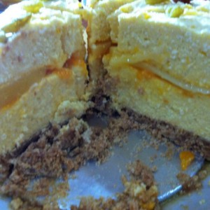 把剩余的芒果粒和布丁铺在第5步已经冷冻好的芝士底,继续冷冻